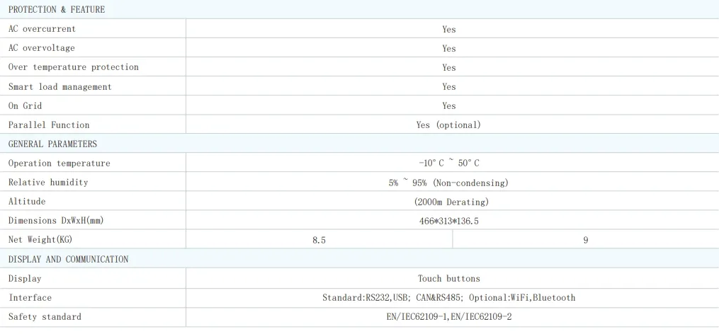 4. Батарея: Функція вирівнювання заряду батареї продовжує термін служби. Зарезервований зв'язок (RS485, CAN) для BMS.